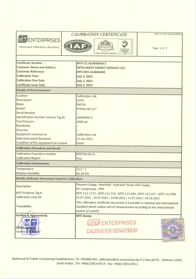 5. Calibration certificate: MTE-CC-A10040440-3_High Pressure Hose 1 (05. July 2022)